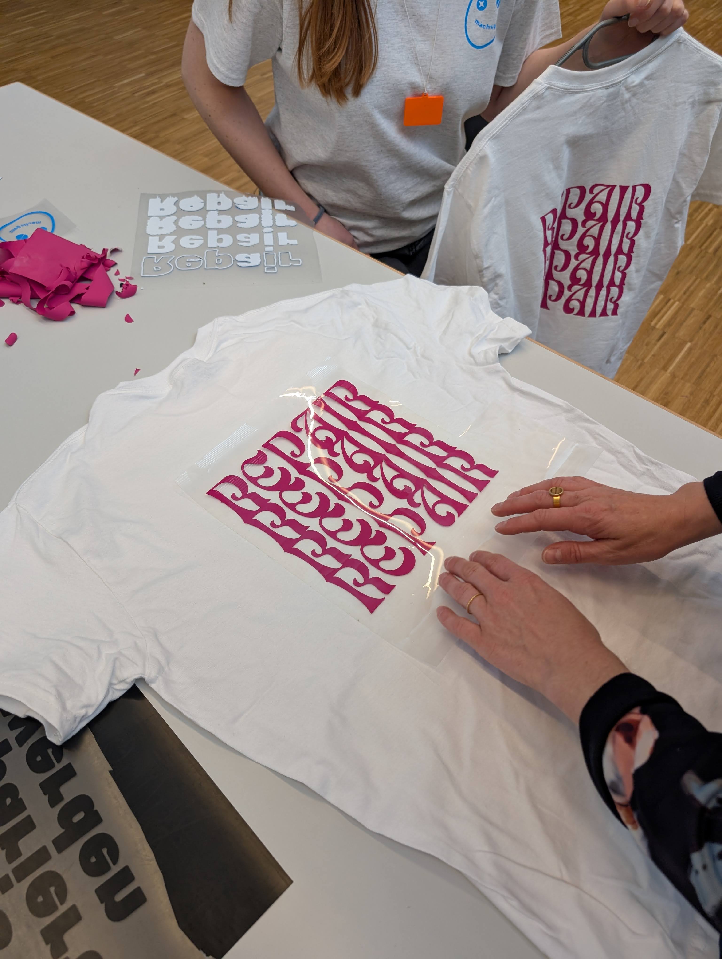 Wir entwerfen coole T-Shirt designs am Computer und schneiden sie mit dem Schneideplotter aus. Dann Bügeln wir die Ergebnisse auf T-Shirts und verleiten alten Klamotten neuen Glanz.